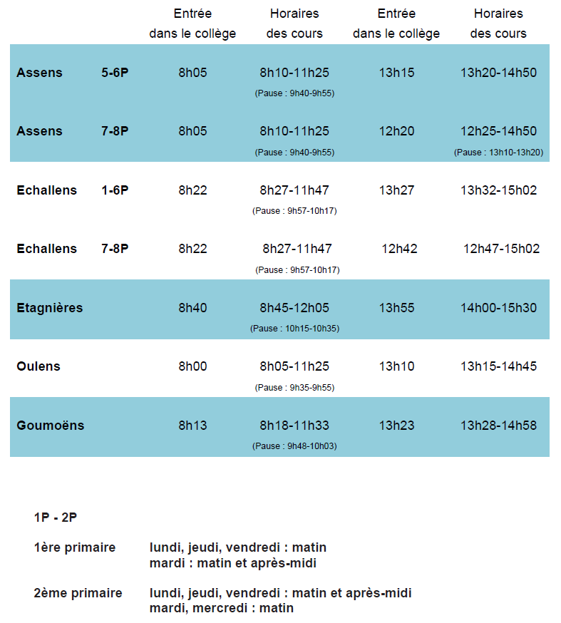 Voici un récapitulatif global des horaires de nos bâtiments:
